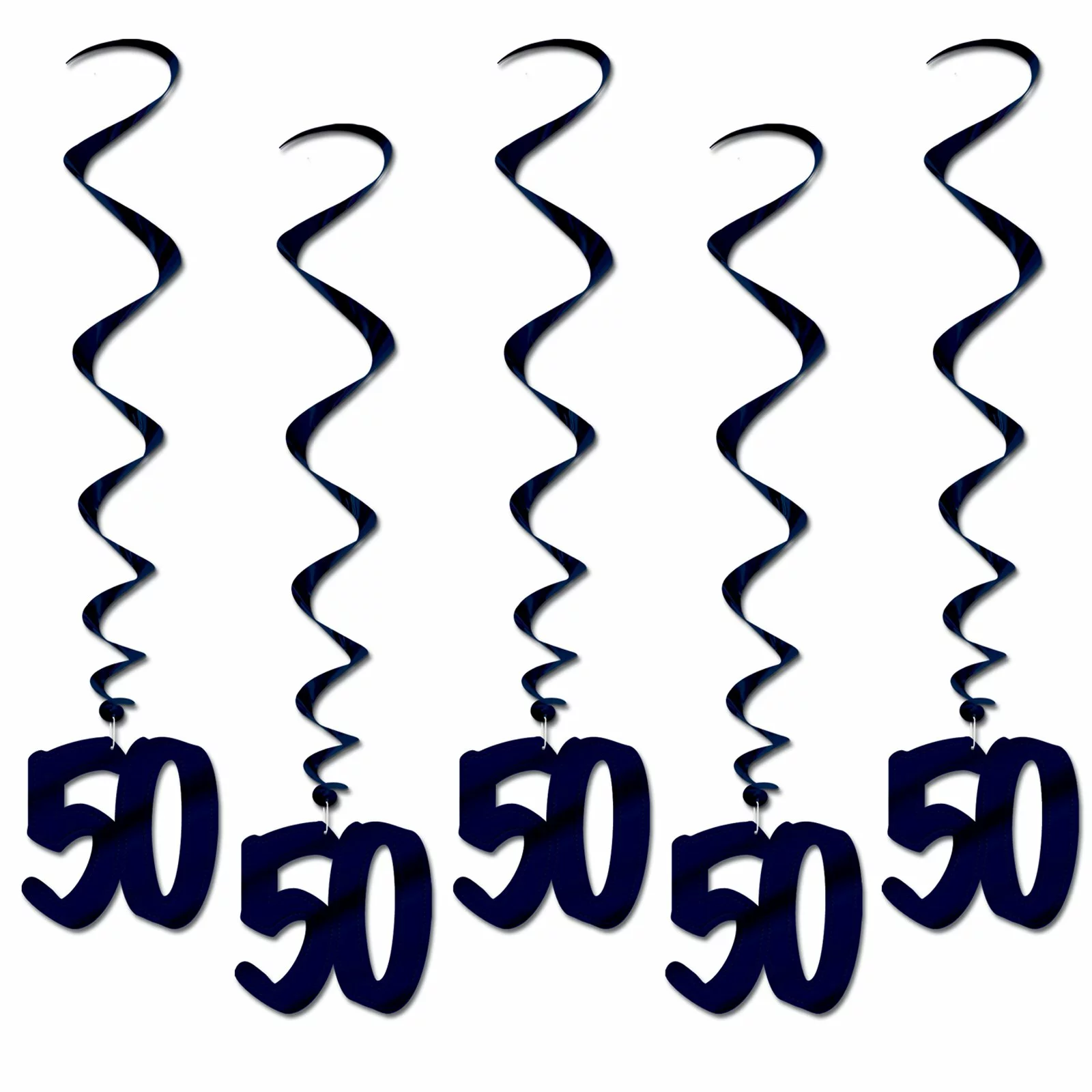 These “50” Hanging Whirls (5 count) are perfect for your adult birthday and feature black whirls with “50” printed on the bottom. Whirls measure approximately 40″ high. Package includes 5 Whirls. Plastic.