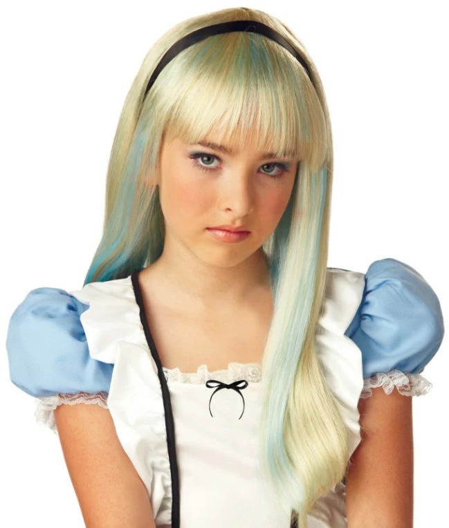 This Alice has grown up and is ready to take another trip to Wonderland in this long, blonde wig with straight hair, light blue highlights and black headband.