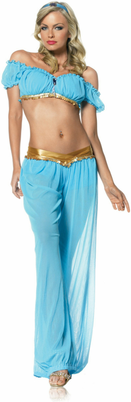 This Arabian Princess is ready to show you a whole new world this Halloween! Her intriguing costume includes a blue headpiece with a golden jewel, a mesh chiffon off-the-shoulder peasant top with gold sequin trim and a dark blue jewel, and matching mesh pants with a gold waistband.