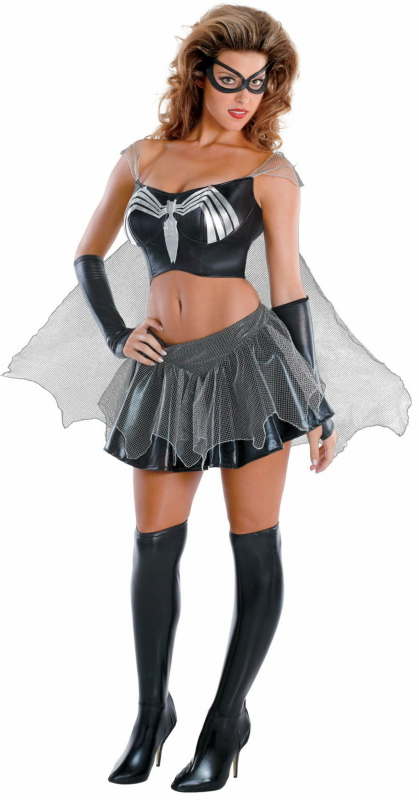Release your inner spider senses with this sexy Black-Suited Spider-Girl sassy prestige adult costume! It includes a black top with sliver spider picture and attached cape, black skirt with silver web-like material, black glovettes, boot covers and eye mask.