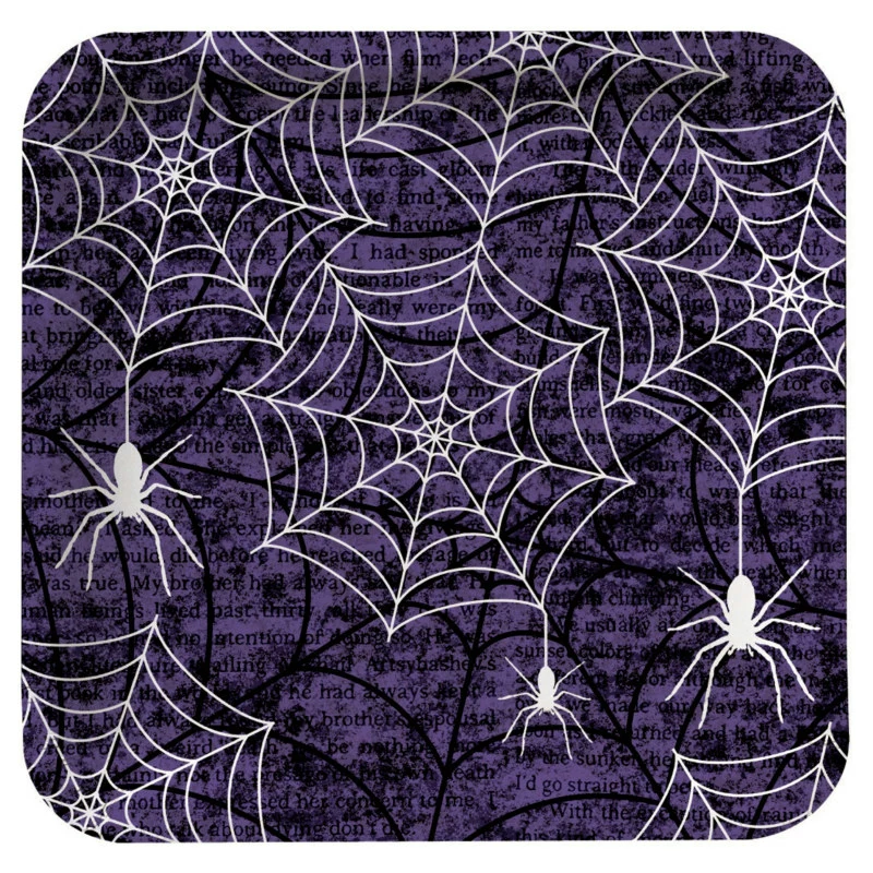 Includes (8) Creepy Webs Square Dessert Plates with a spiderweb pattern on a purple background. Paper Plates are approximately 7″ wide. Look for additional Creepy Web items (sold separately).