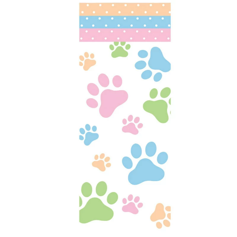 This Dog Paws Plastic Tablecover has blue, pink, green and peach paw prints of all sizes all over with a polka dot trim of blue, peach, green and pink. Tablecover measures approximately 54″ high x 102″ wide. Look for coordinating plates, napkins and centerpieces (sold separately).