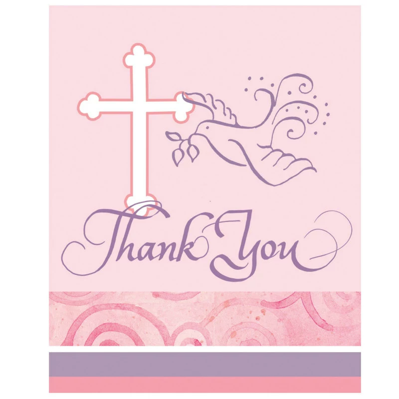 These Faithful Dove Pink Thank You Cards (8 count) make a classy thank you for your guests. The inside has space for your personal message. Package includes 8 envelopes.