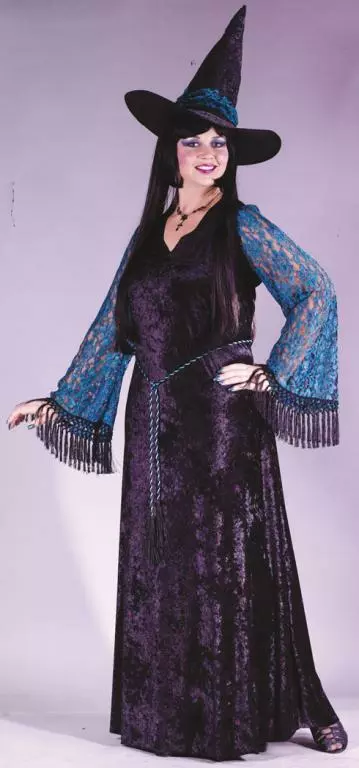 Lovely WitchCostume includes: Gown with Gothic Lace Sleeves & Tassels, Tassel Tie Belt, Gothic Lace Witch hat.Available size: