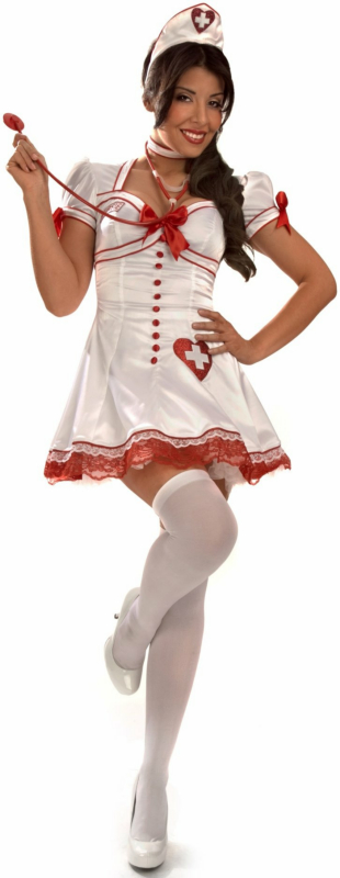 So there’s no diploma on her wall – but she definitely received her degree in seduction! This sexy Nursie Adult Costume includes a white mini-dress with red trim and embellishments, a matching collar, and a white nurse headpiece with a red glitter heart applique. Everything you need to keep your patients a little hot under the collar!