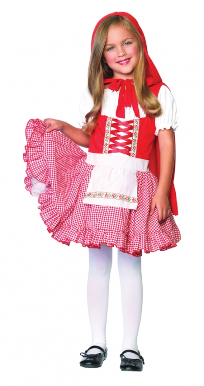 Includes: Gingham peasant apron dress with woven ribbon trim and matching hooded cape.