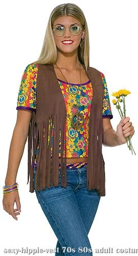 Brown Faux Suede Fringe VestAdd a cool, 70’s flair to your hippie costume with this Sexy Hippie Vest. The 70s vest is made of a brown suede-like material and features long fringe that starts just below the chest. You’ll be fit for peace and love with this Sexy Hippie Vest.