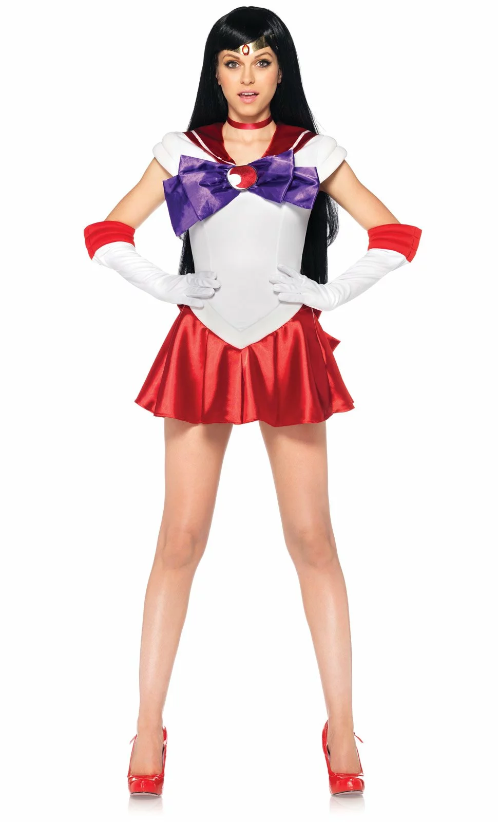 The Sexy Sailor Moon Sailor Mars Adult Plus Costume includes pleated dress with oversized bows and moon applique, gloves, choker, and matching head piece.