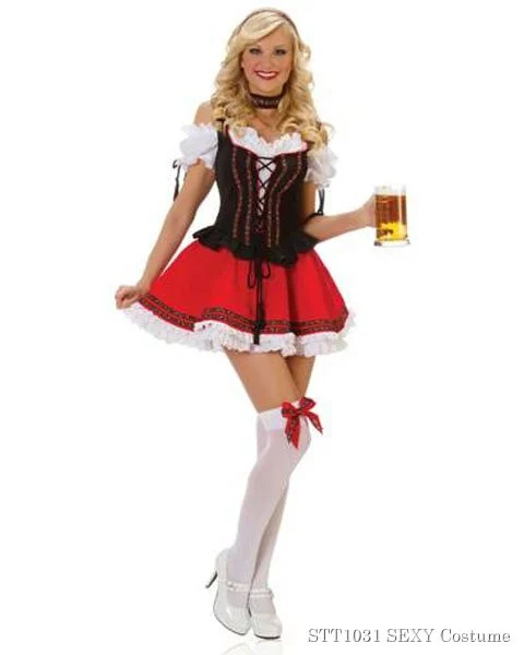The Sexy Swiss Girl Womens Beer Girl Costume is the perfect outfit for your next Halloween party, Oktoberfest parade, or beer week celebration. This sexy Swiss beer girl costume features a traditional dress with authentic details and sexy elements that will make everyone line up for a pour from you. This sexy beer girl costume features a black corset top with sexy criss cross lacing and traditional floral ribbon trim with a bow that ties at the waist, a short ruffled peplum, an off the shoulder white peasant style top, and a red flared skirt with matching white ruffle and floral ribbon trim. Sexy beer girl costumes also include a ribbon neckpiece and a coordinating headband. Halloween costumes can be enhanced by adding on a pair of sexy thigh highs with bows or ruffle trim, a pair of red or black heels, and a beer stein or classic beer mug.