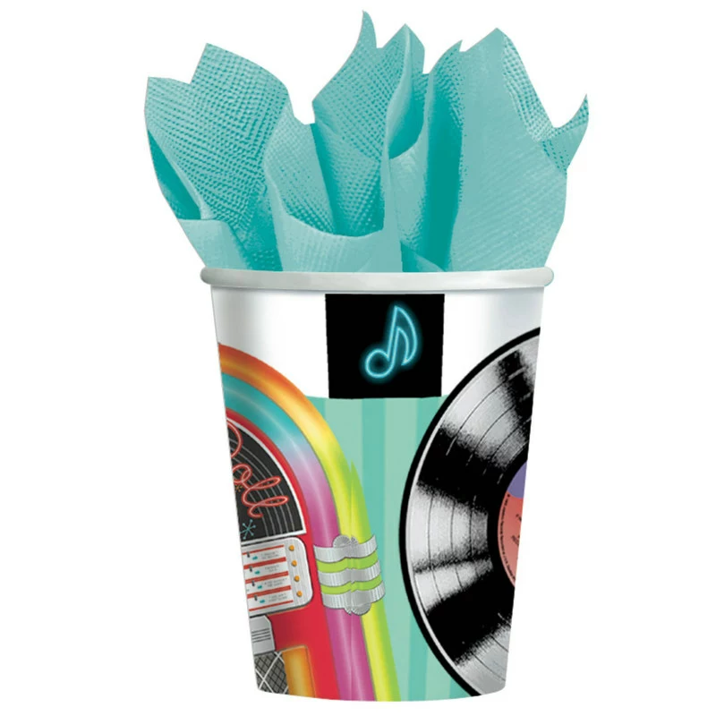 Contains 8 Sock Hop-themed 9 oz. paper cups. Please Note: Napkin pictured inside cup in above image is not included. Also look for matching plates and napkins (sold separately).