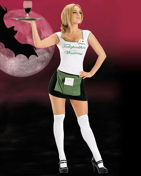 As a telepathic Waitress you can read the minds of everybody at the Halloween party but unfortunately, you may not be able to read a vampires mind. That is one way you can tell the difference between a human and a vampire. Since it is sometimes nice not to know what others are thinking, Telepathic waitresses tend to gravitate toward vampires. The Sexy Women’s Telepathic Waitress Costume features a dress, apron, thigh highs and an I Love Vampires Pin. The dress has a white t-shirt top with Telepathic Waitress screened across the front in green and a black skirt bottom. The green apron is great for holding everything from a pad and pen for taking order to your cell phone and lipstick.
