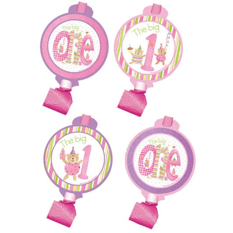 The Big 1 – Girl Blowouts (8 count) are pink with a printed circle and “The big one” and teddy bears in the center. Look for more 1st birthday party supplies (sold separately). Adult assembly required.